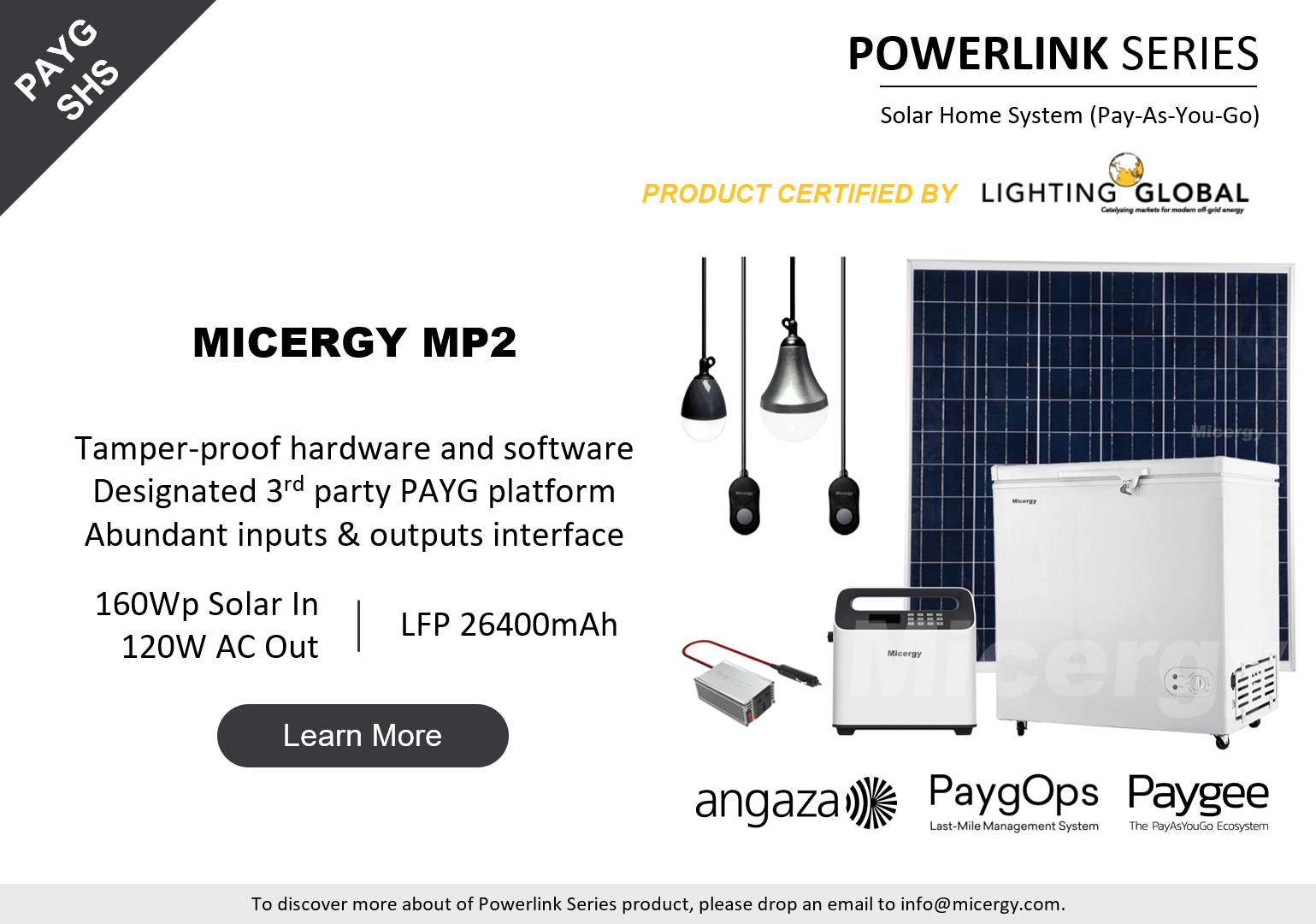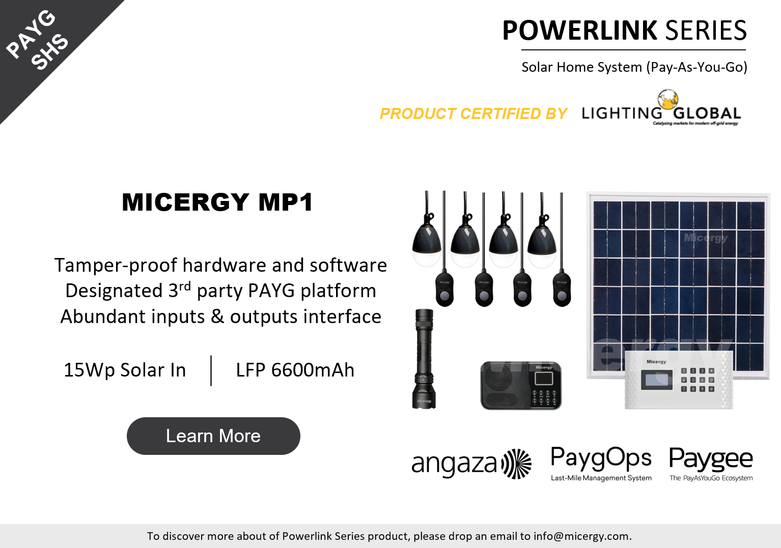 Is there any way to solve the problem mentioned above and improve the Pay-As-You-Go Solar Home System with less trouble on aftersales? The answer is yes, Micergy design and manufacturing PAYG Solution at the highest level of quality, user-friendly and tamper-resistant level to help PAYG Operators decrease the default rate, welcome to visit Micergy website www.micergy.com or drop an email to info@micergy.com for more information.