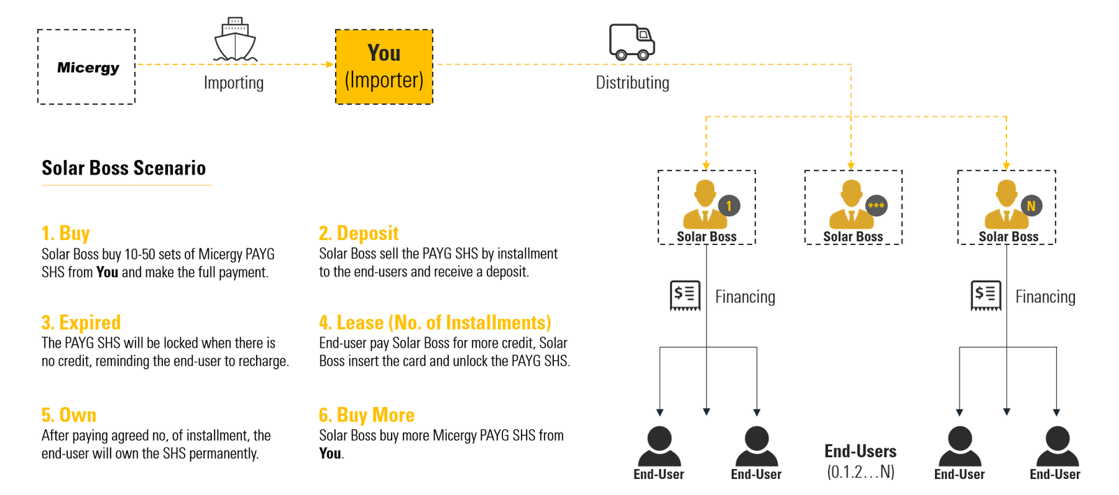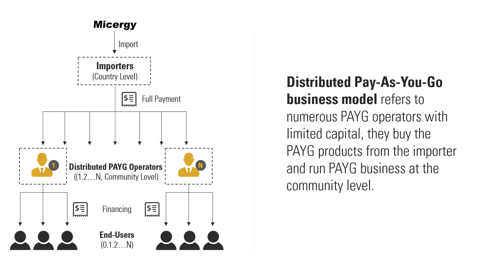 Distributed Pay-As-You-Go business model refers to numerous PAYG operators with limited capital, they buy the PAYG products from the importer and run PAYG business at the community level.