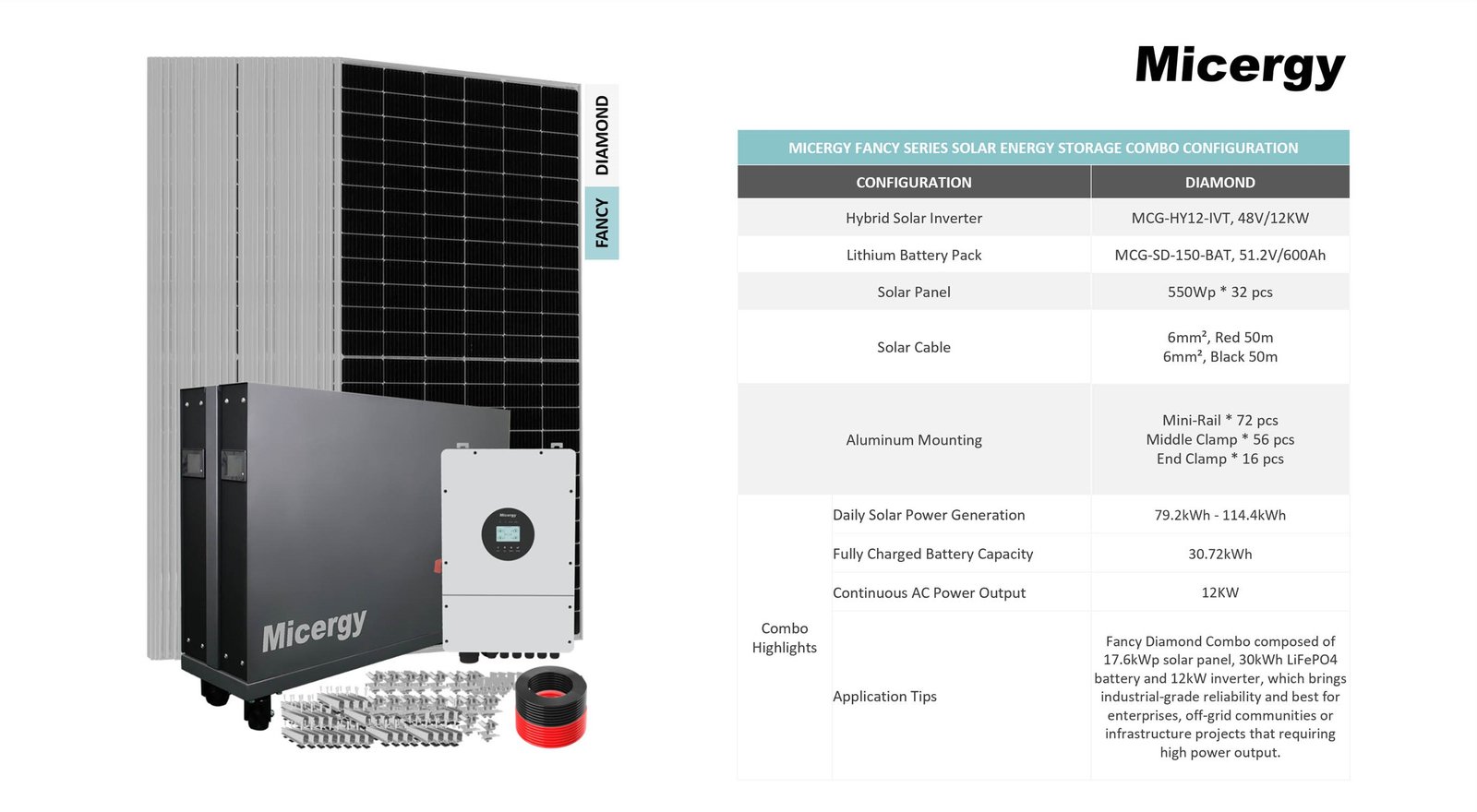 - Application Tips: Fancy Diamond Combo composed of 17.6kWp solar panel, 30kWh LiFePO4 battery and 12kW inverter, which brings industrial-grade reliability and best for enterprises, off-grid communities or infrastructure projects that requiring high power output.
