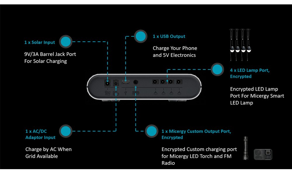 - Output Ports: 1*5V/1A USB, 4*6V/0.4A Lamp Port, 1*6V/0.4V Torch/Radio Port