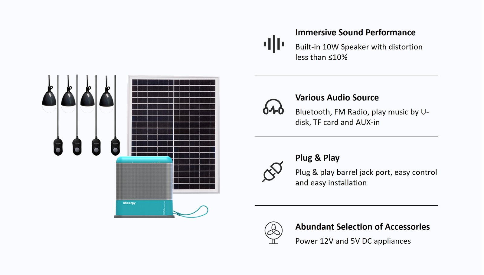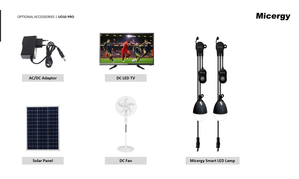 - Optional Accessories: AC/DC Adaptor, Solar Panel, LED Bulbs, DC Fan, DC TV