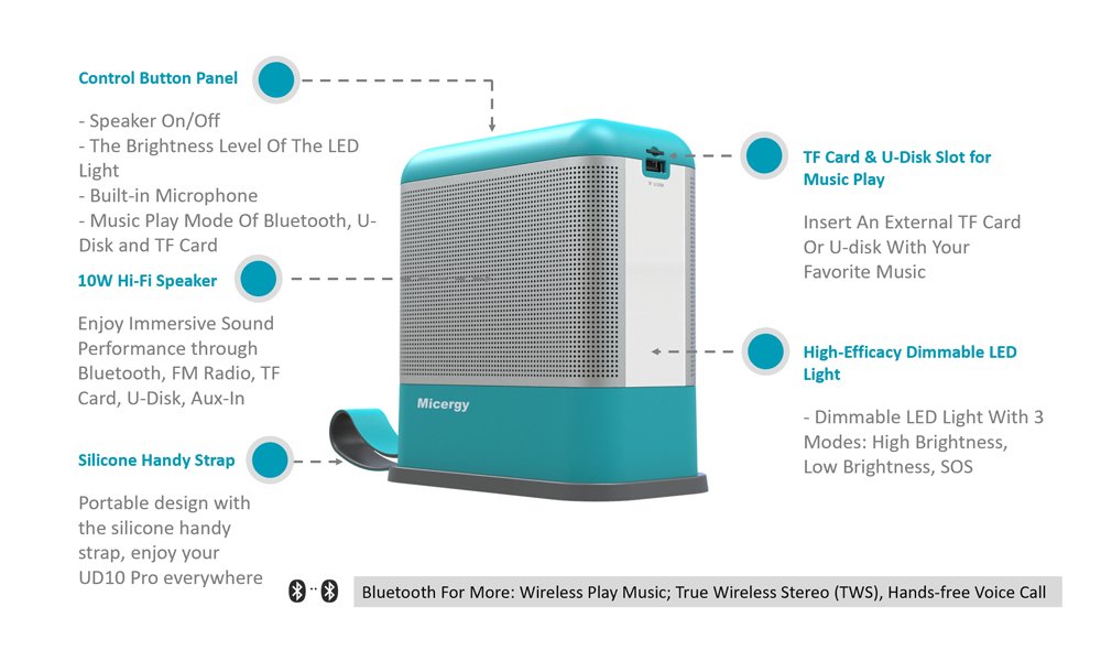 - Features: Built-in 10W Speaker, Support Bluetooth/FM/U-Disk/TF/Aux-in